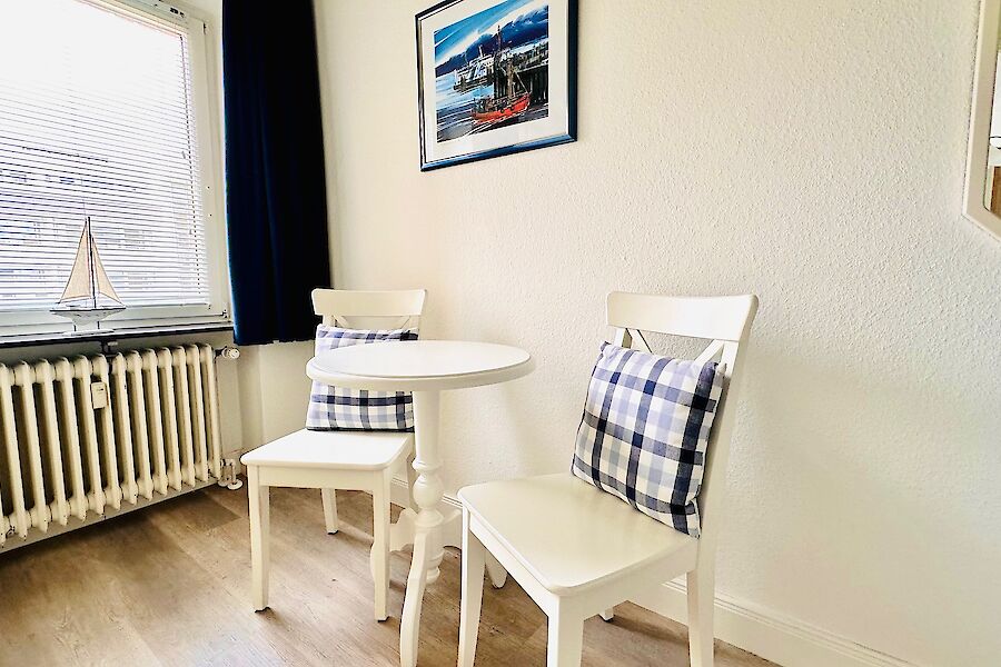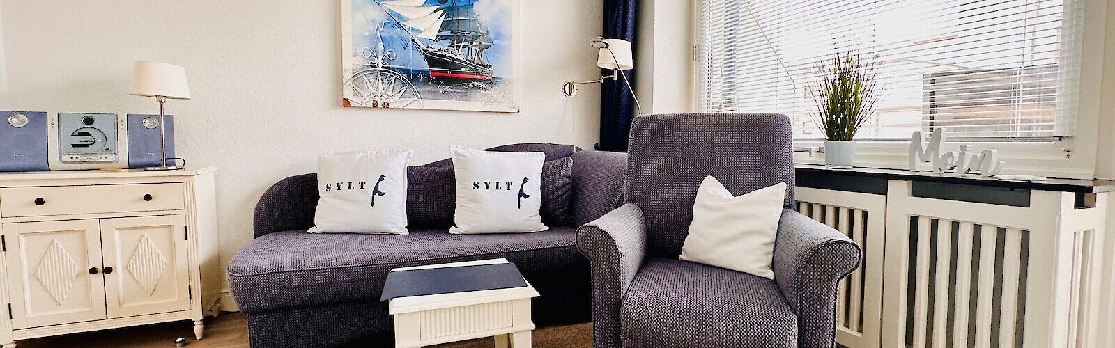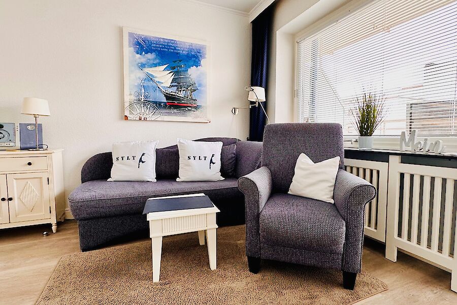 Die Sylter Nachmittagssonne begleitet Sie auf dem großen möblierten Westbalkon bis zum abendlichen Sundowner. Garantiertes Wohlbefinden finden Sie dann auf einer neuen Couchgarnitur in dem im stimmigen Küsten-Blau gehaltenen Wohnzimmer. Eine kleine Buchauswahl und schöne CDs sorgen für zusätzlichen Genuss.
