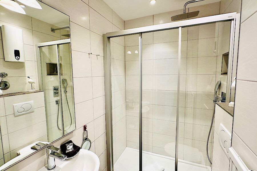Das moderne Badezimmer ist mit einer großen Regendusche ausgestattet.